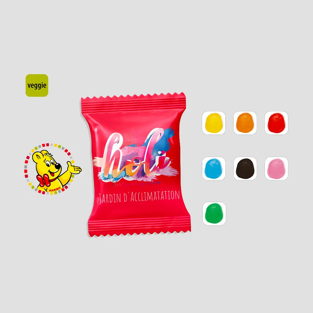 Marque et réassurance. Haribo bénéficie d’une reconnaissance immédiate et d’un capital sympathie unique. Cette notoriété grand public sert la communication professionnelle : le destinataire identifie instantanément le produit, comprend le geste et associe votre marque à un moment agréable. Dans un cadre publicitaire, cet effet de familiarité soutient la mémorisation du message personnalisé et renforce l’impact visuel du logo. Choisir une valeur sûre, c’est réduire l’aléa d’acceptation et sécuriser l’expérience de distribution lors d’un évènement, d’un salon ou d’un séminaire.